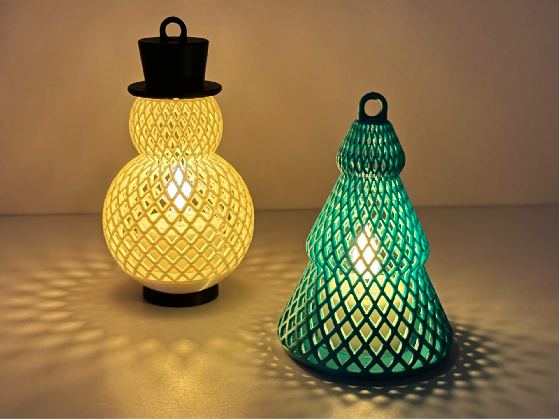 Bring holiday cheer home with a mesh‑style Christmas tree and cheerful snowman. Both pieces are 3D‑printed from eco‑friendly PLA and cast magical patterns when illuminated, making a charming pair for mantle or tree.